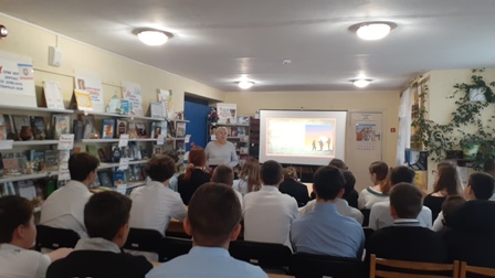 Заведующая библиотекой рассказала о героях, российских военнослужащих, участвующих в специальной военной операции, которые защищают интересы нашей страны и нашего народа. Вместе с ребятами вспомнили выпускников школы Кичинского Ивана и Шпыхова Виктора, отдавших свою жизнь в ходе специальной военной операции. Рассказ сопровождался видео презентацией.
